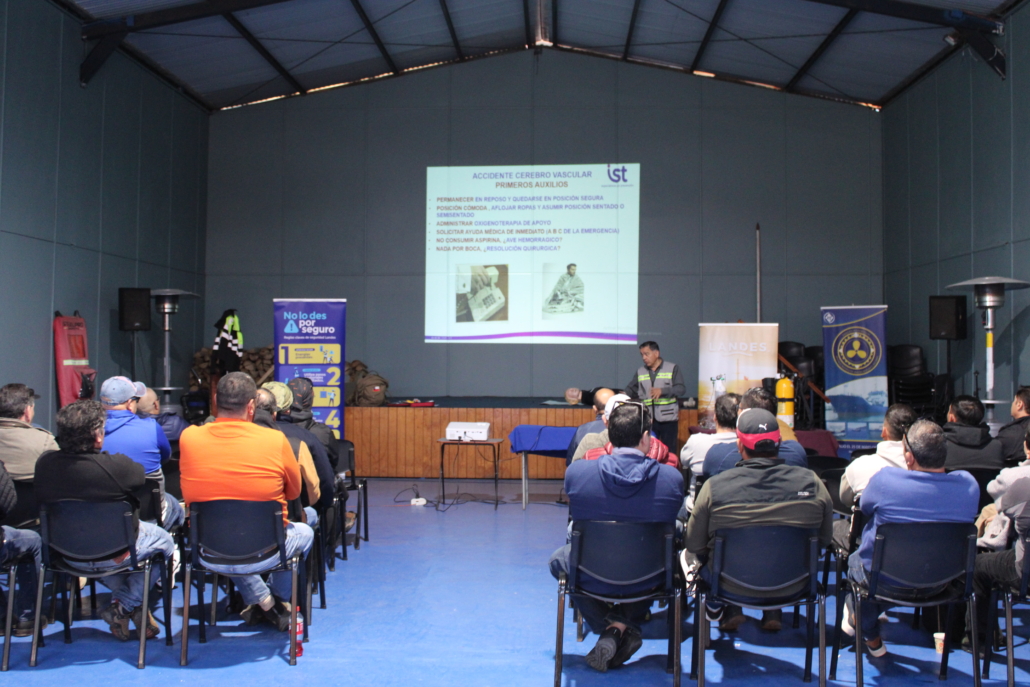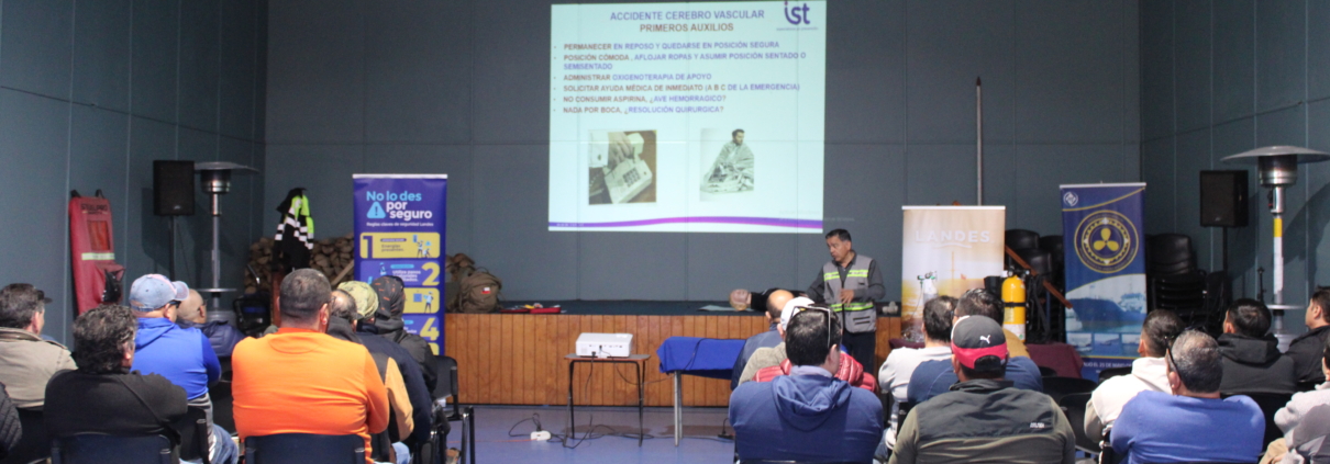 En el recinto se reunieron más de 30 trabajadores de la empresa Landes, quienes participaron en una charla informativa impartida por el IST, con el objetivo de aprender técnicas de primeros auxilios en caso de accidentes ocurridos a bordo de barcos pesqueros.
